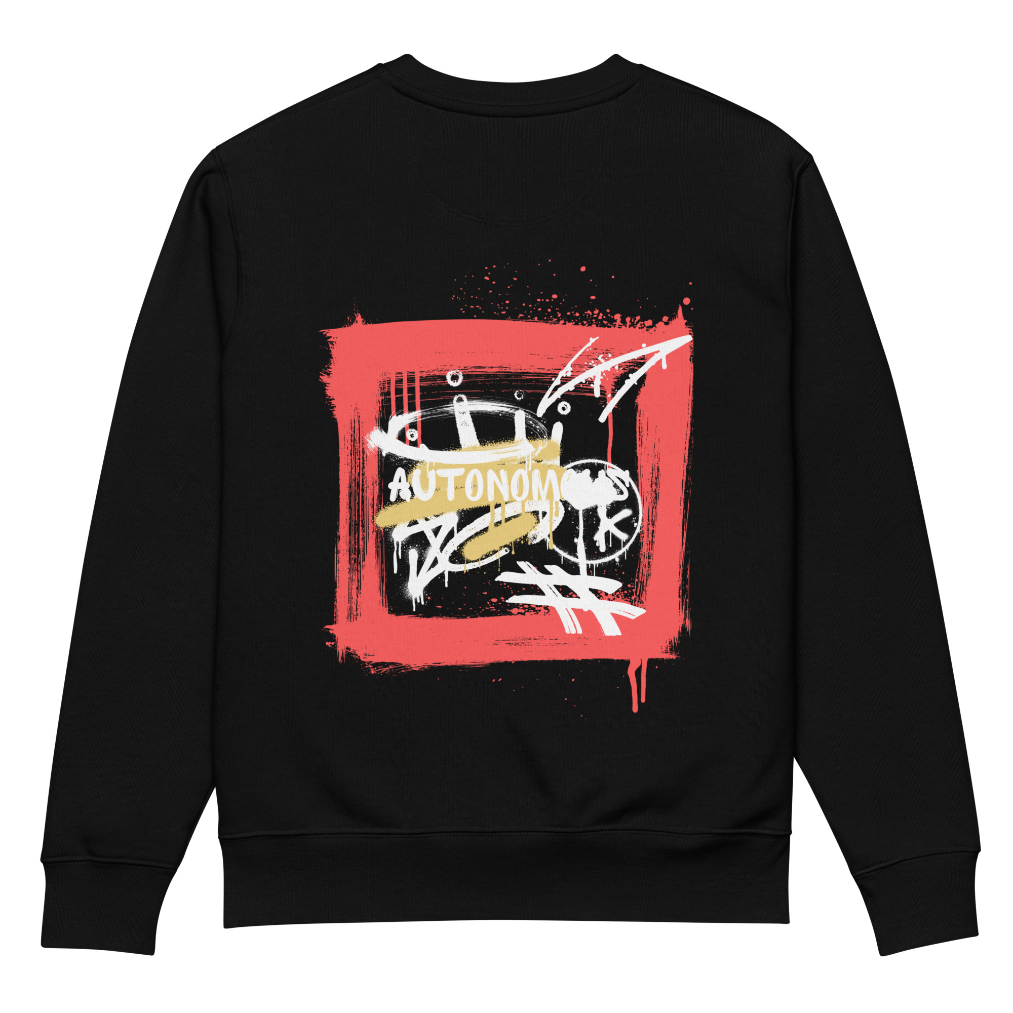 Embrace your individuality with our ‘Autonomous’ sweatshirt, featuring a bold and eye-catching design. The white background is splattered with red and yellow paint, creating a unique and edgy look. The word ‘Autonomous’ is written in black, with a yellow line running through it, symbolizing freedom and independence. The surrounding red border adds a pop of color and energy to the design. Made from comfortable and high-quality materials, this sweatshirt is perfect for anyone who wants to express their autonomy and creativity. The shirt has a chic, crisp look and will go great with both casual and more dressed up outfits. Made of organic cotton, this sweatshirt is durable, comfy, and extra soft.